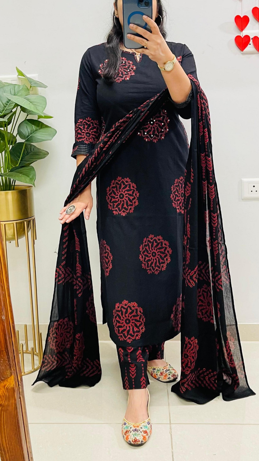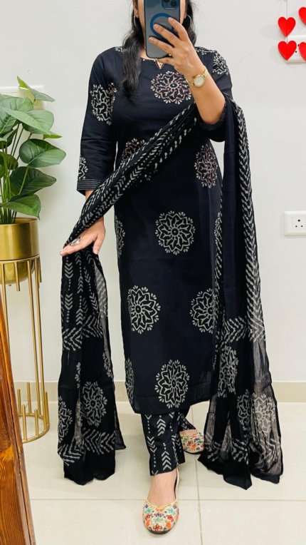 Designer Black Beauty in Block Cotton Fabric with detailing thread work on yoke & trending lace on sleeves… 🖤❤️