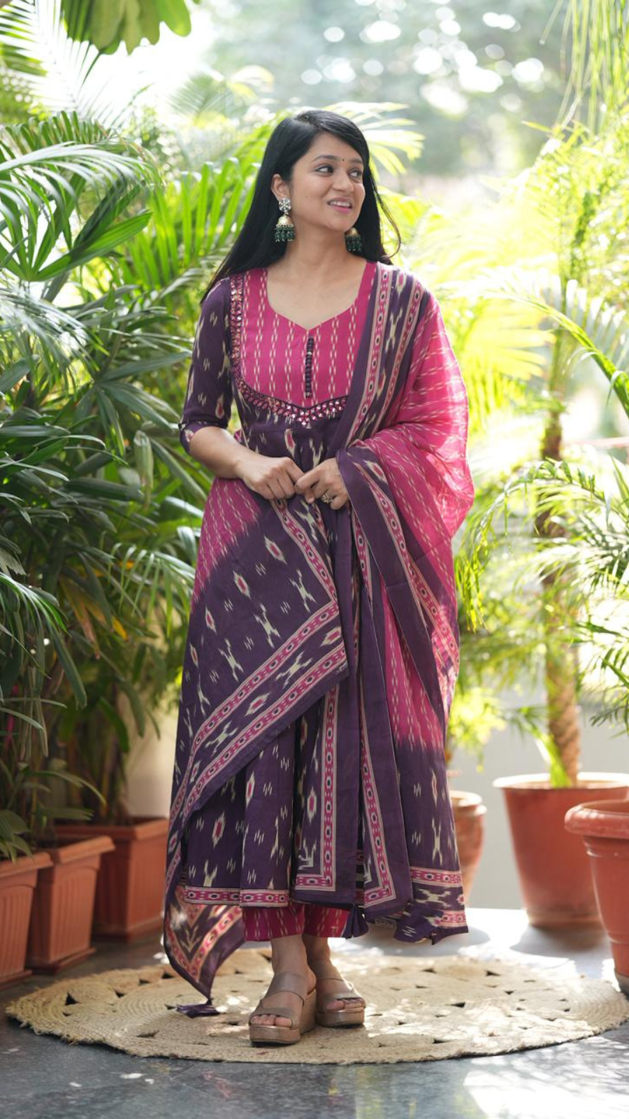 Make a dazzling statement with this ikkat print anarkali kurta three piece suit in cotton 60*60. It features beautiful thread mirror embroidery 🪡 pattern. 3/4th sleeves paired with pure cotton printed duppata….