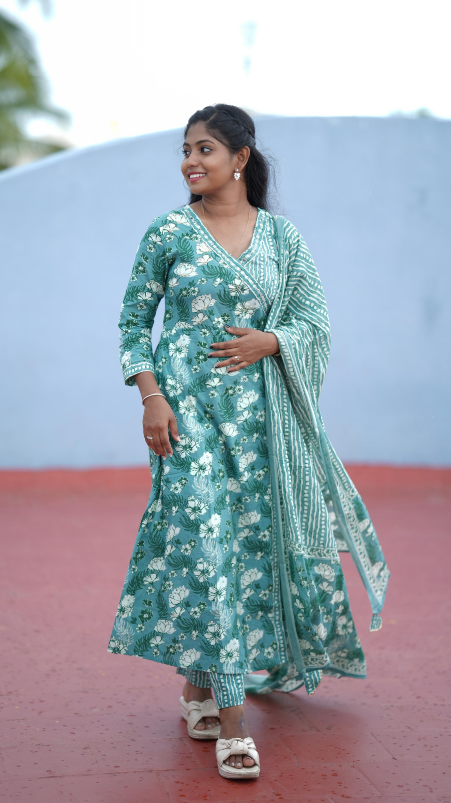 Shop our cotton side slit A Line Angrakha three piece set finished with handwork in the yolk part…