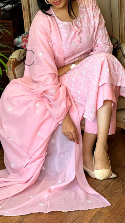 Slay effortlessly with our cotton embroidery Suit Set. The set comprises a cotton embroidery kurta paired with a bottom and cotton mul Dupatta with full embroidery work.