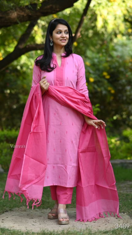 You will be so much in love with pure handloom south cotton hand woven fabric out fit. combinations of South handloom thread handloom cotton fabric and self hand woven butti .same south cotton pant paired with kota Doria duppata