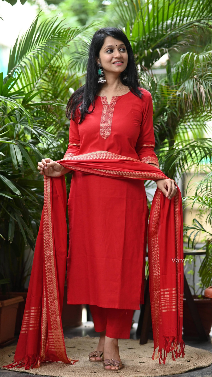 You will be so much in love with this Chettinad handloom cotton outfit for combinations of self golden thread handloom work kurta and south cotton pant paired with south cotton duppata self thread self weaving add a unique vibe.