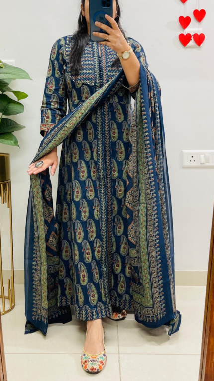 Shop this never seen before outfit….. Black and rust discharge cotton printed three piece cotton anarkali is just perfect for your every occasion to look absolutely classy and different….stylish neck coutch pattern.