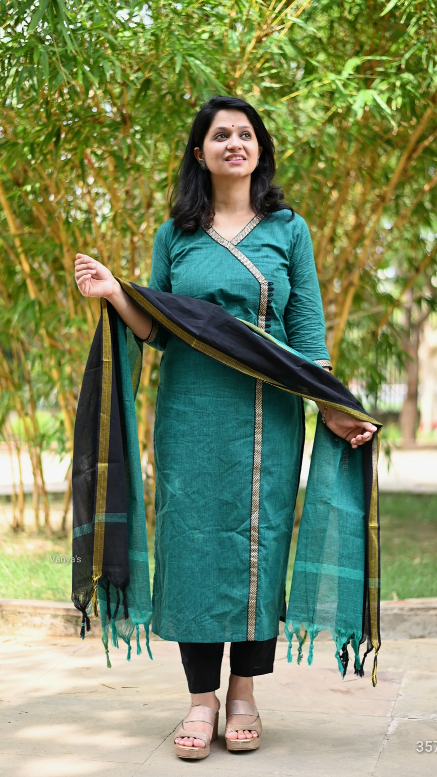 A sophisticated and traditional ensemble featuring south handloom cotton kurta, complemented by a vibrant black dupatta and matching same colour south cotton pant. The attire is an exquisite blend of cultural richness and contemporary style.